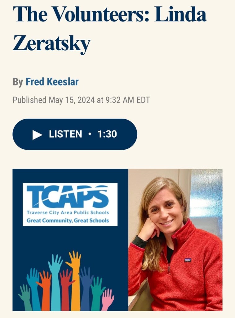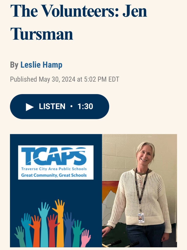 Big thanks to Interlochen Public Radio for telling the stories of Jen, Linda, Tom, Sharon and Mary, who mentor in our schools to help kids succeed.