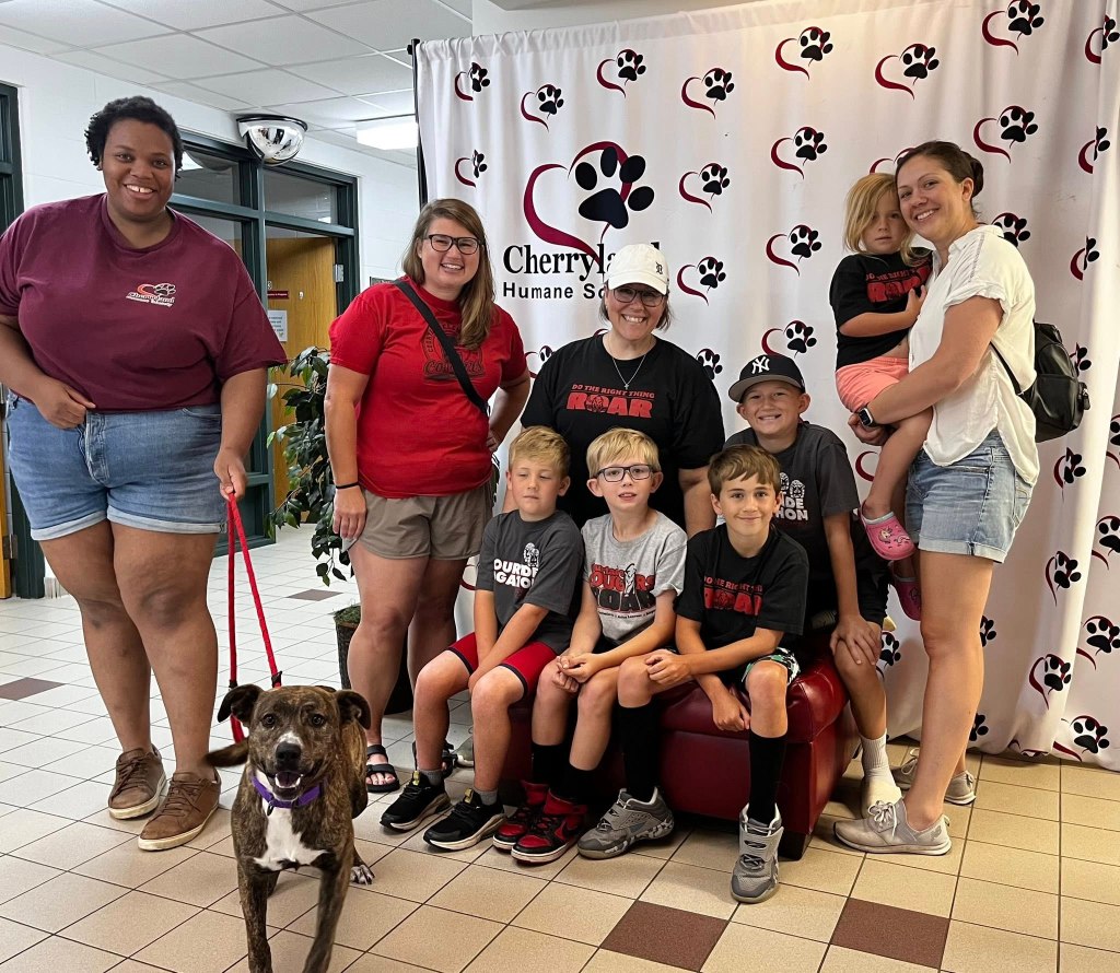 Cute photo of Mrs. Helman and some Cougar friends at the Cherryland Humane Society, where they dropped off their $2,038.86 donation check from their second-grade lemonade stand! (Photo credit: Courtade Elementary)