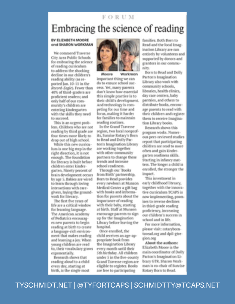 I am grateful for this opportunity and excited to work for our Traverse City area kids while focusing on my campaign priorities.